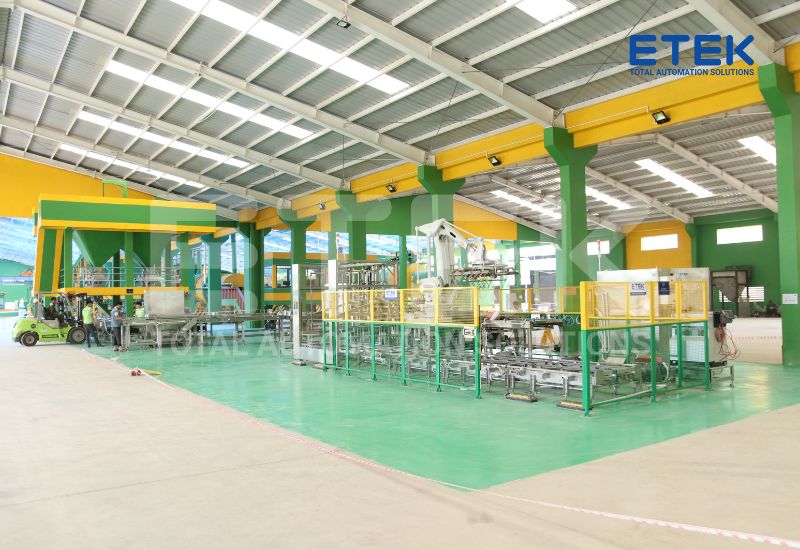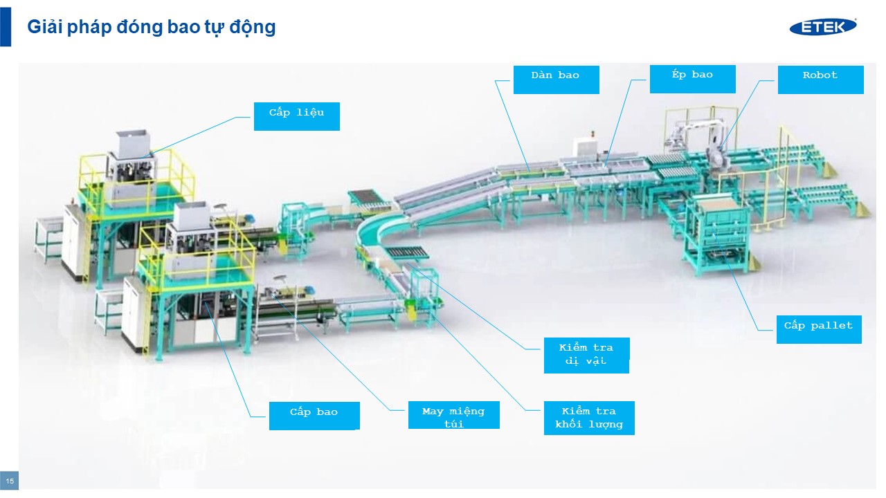 ETEK đã phát triển thành công một dây chuyền đóng bao hoàn toàn tự động, có khả năng đạt công suất lên đến 1200 bao mỗi giờ. Hệ thống tự động này tích hợp nhiều thiết bị và công nghệ tiên tiến, từ hệ thống băng tải vận chuyển tự động, máy in bao, hệ thống kiểm tra thông tin và cân trọng lượng tự động, đến tính năng phát hiện và loại bỏ bao lỗi.