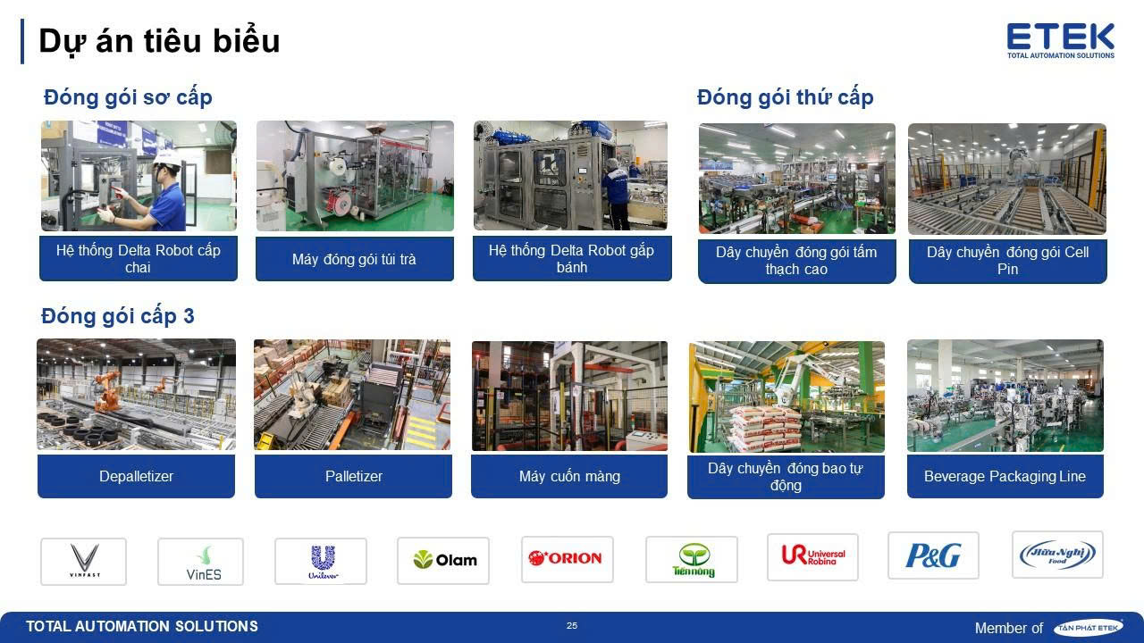 ETEK đã triển khai thành công hàng trăm dự án dây chuyền đóng gói tự động tại các nhà máy sản xuất trên toàn quốc, trải dài từ Bắc vào Nam và nhiều thị trường quốc tế. Không chỉ chinh phục các doanh nghiệp nội địa, ETEK còn từng bước xâm nhập vào các thị trường có yêu cầu kỹ thuật và tiêu chuẩn chất lượng khắt khe như Hàn Quốc,…