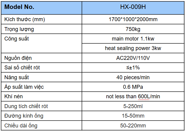 3. Thông số kỹ thuật của Máy chiết rót và hàn tuýp