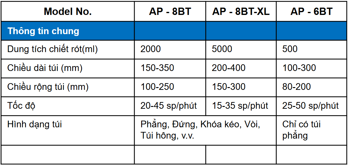 • Đa dạng loại túi: Hỗ trợ túi phẳng, túi đứng, có khóa kéo, vòi, hông – đặc biệt tối ưu với model như AP-6BT.