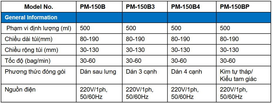 Máy có nhiều model khác nhau, chẳng hạn như PM-150B, PM-150B3, PM-150B4 và PM-150BP, mỗi model có thể được thiết kế để phù hợp với các phương thức đóng gói cụ thể như dán sau lưng, dán 3 cạnh, dán 4 cạnh, hoặc dạng kim tự tháp/kiểu tam giác. Nguồn điện sử dụng phổ biến là 220V/1ph, 50/60Hz, phù hợp với hầu hết các cơ sở sản xuất.
