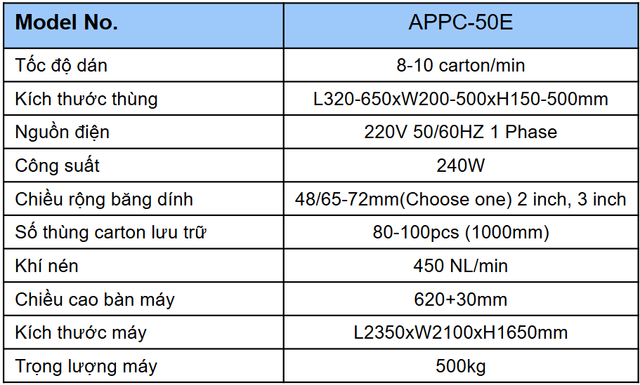 Dưới đây là bảng thông số kỹ thuật chi tiết giúp quý khách hiểu rõ hơn về hiệu suất của Máy Dựng Thùng Tự Động: